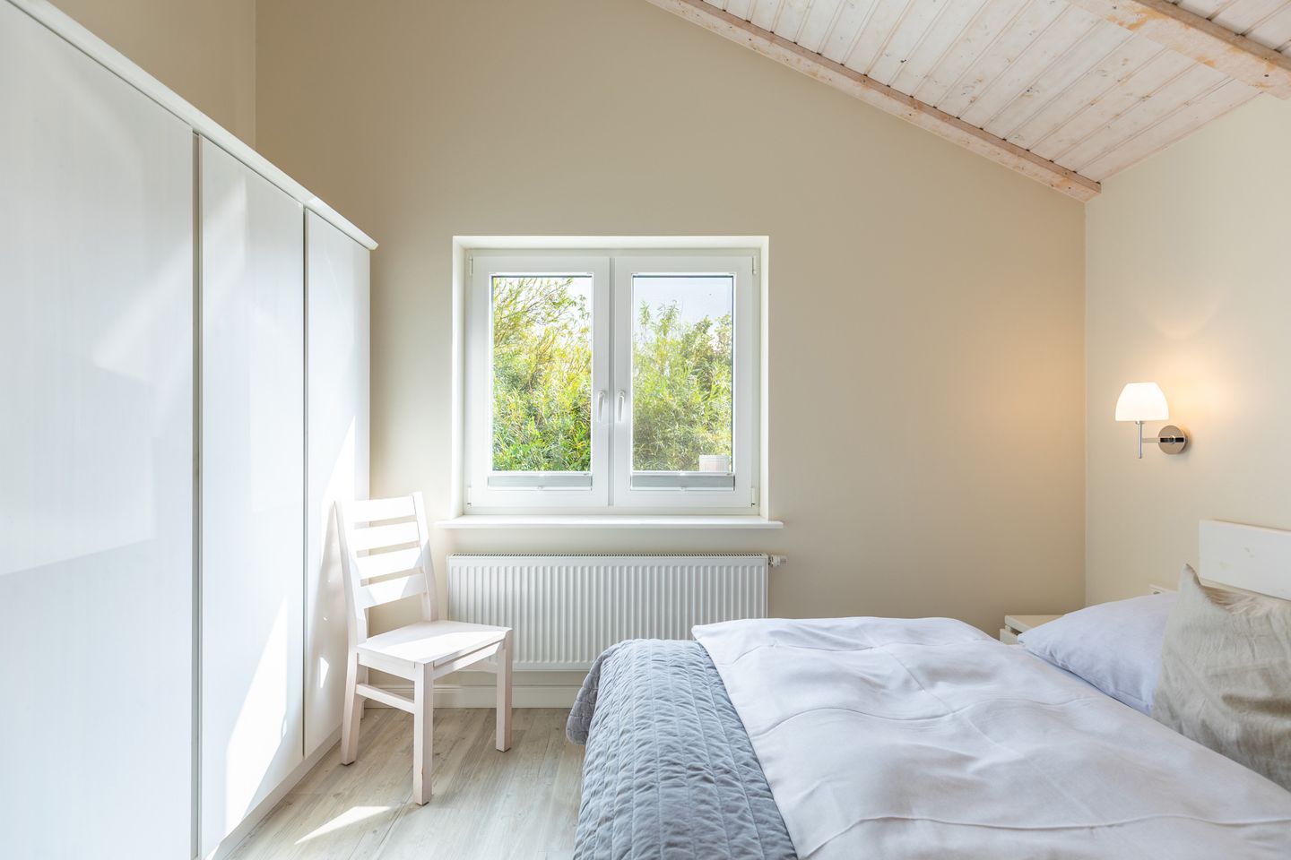 Das 80 qm große Ferienhaus ist modern und exklusiv im skandinavischen Charme eingerichtet. Die zwei Schlafzimmer mit jeweils einen Komfort-Doppelbett (180 x 200 cm) bieten Platz für bis zu vier Personen. Die Schlafzimmer sind mit Fliegengittern ausgestattet.