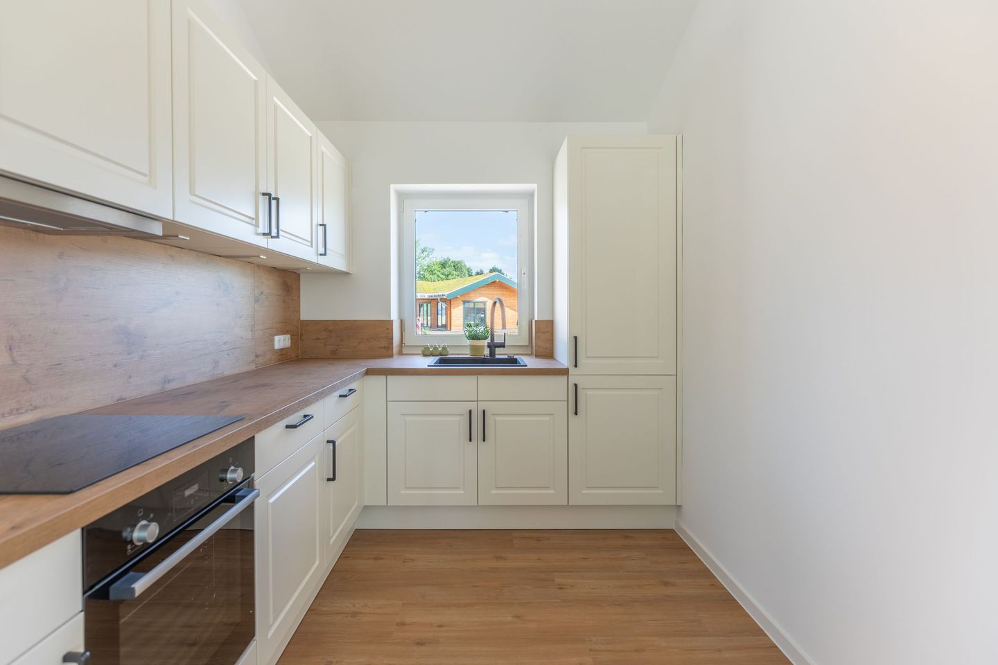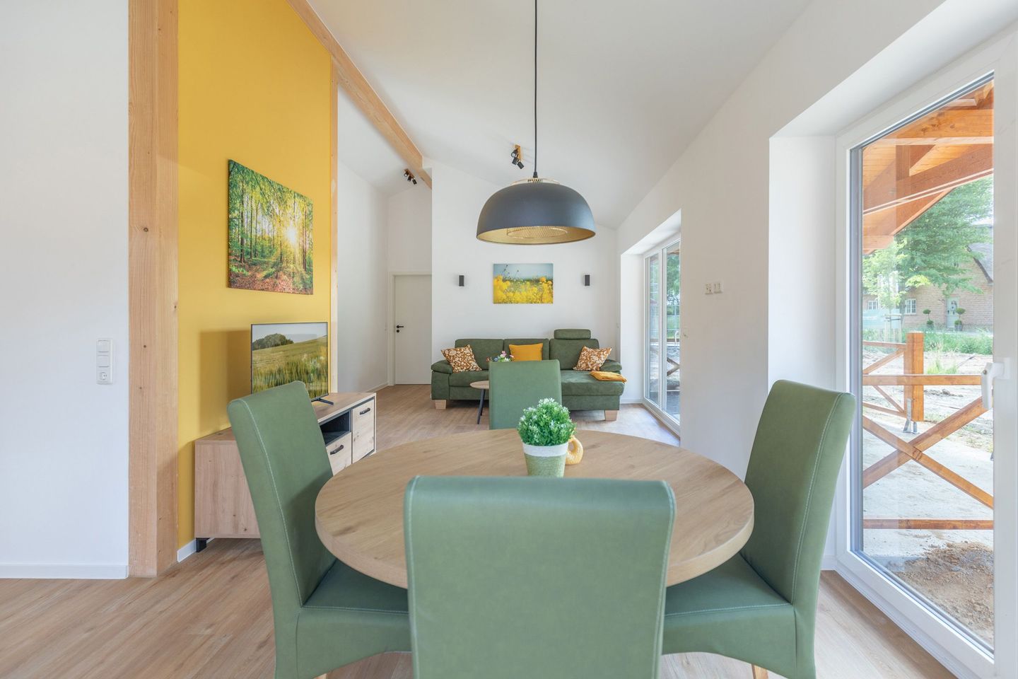 Die offene Küche ist voll ausgestattet mit Induktionskochfeld, Backofen, Mikrowelle, Spülmaschine, Senseo-Kaffeemaschine und Kühlschrank mit Gefrierfach – perfekt für gemeinsame Kochabende. Im gemütlichen Wohnbereich laden eine Sofaecke und ein SMART-Fernseher zum Verweilen ein. Kostenloses, schnelles WLAN hält Sie jederzeit online. Der angrenzende Essbereich bietet ausreichend Platz für alle Gäste.