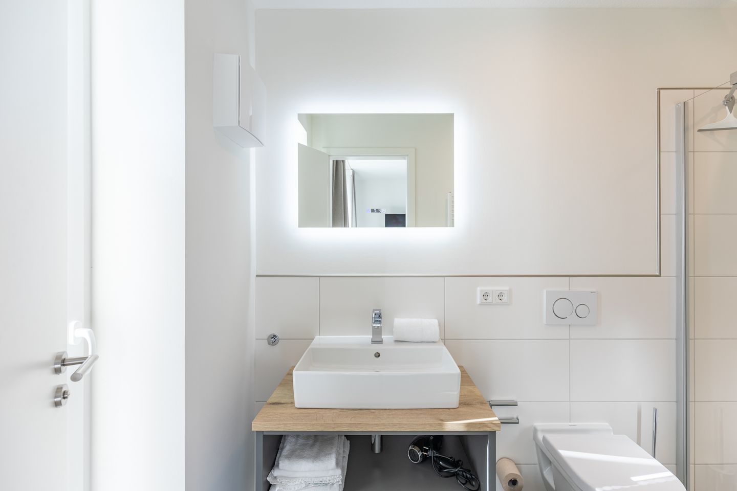 Das Apartmenthaus ist im Frühjahr 2023 fertiggestellt worden. Es liegt direkt am Kurzentrum, hinter dem Deich.