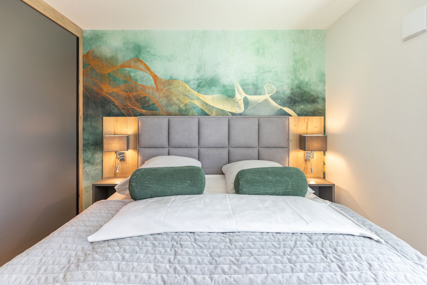 Die Wohnung verfügt über zwei separate Schlafzimmer mit komfortablen Schlafmöglichkeiten und hochwertigem Fliesenboden. Sie eignen sich ideal für Familien, Paare oder kleine Reisegruppen. Zwei moderne Badezimmer, ausgestattet mit bodengleichen Duschen, stilvollen Waschtischen, Fenstern und Haartrocknern, sorgen für zusätzlichen Komfort und Wohlbefinden.