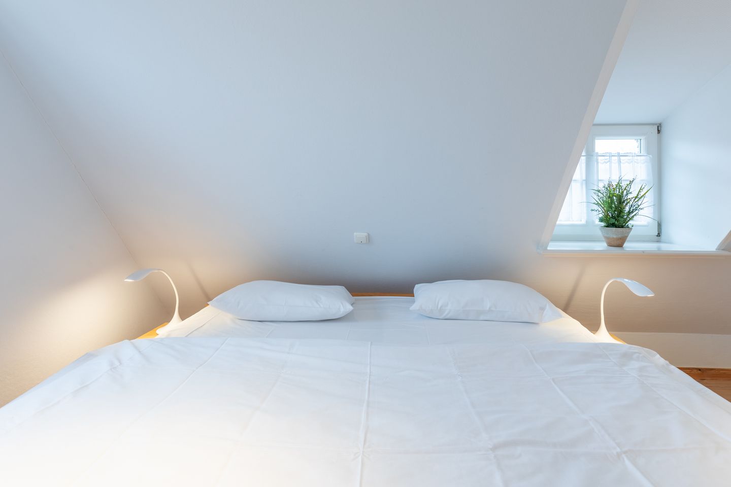 Im Obergeschoss haben Sie Zugang zu zwei Schlafräumen: Schlafraum 1 mit einem Doppelbett (200 x 200), Schlafraum 2 mit einem Einzelbett und einem Schlafsofa. Das Badezimmer mit Dusche und WC rundet das Bild ab.