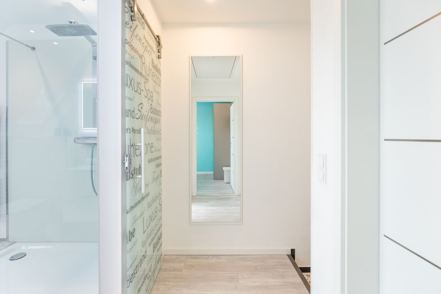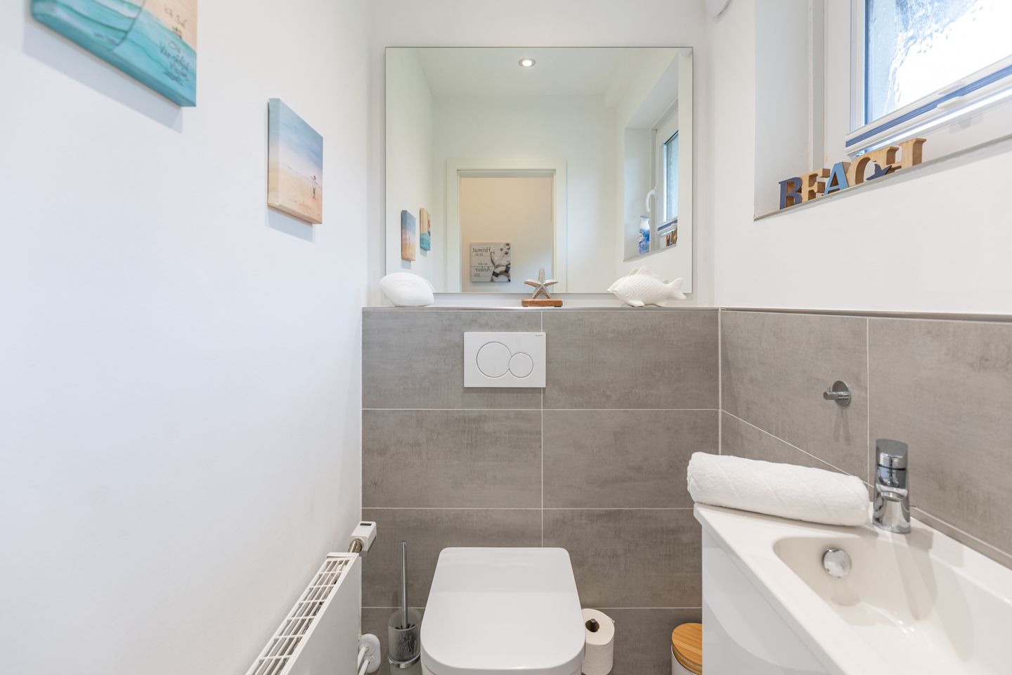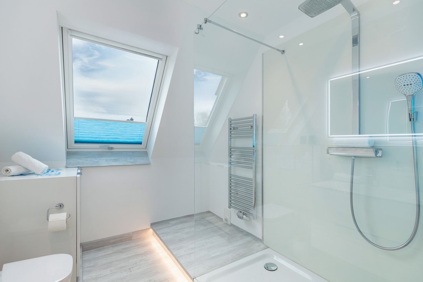 Das Badezimmer (1. OG) ist hell und modern gestaltet und verfügt über eine Dusche, WC, Waschtisch, Kosmetikspiegel und ein Fenster, das für angenehmes Tageslicht sorgt. Ein zusätzliches Gäste-WC erhöht den Komfort für Familien und kleine Gruppen. Fußbodenheizung und Öl-Heizung schaffen ein angenehmes Raumklima, während Waschmaschine, Trockner, Bügeleisen, Bügelbrett und ein Wäscheständer den Alltag während des Aufenthalts erleichtern. Sichtschutz an allen Fenstern sowie ein Ganzkörperspiegel runden den Komfort ab.