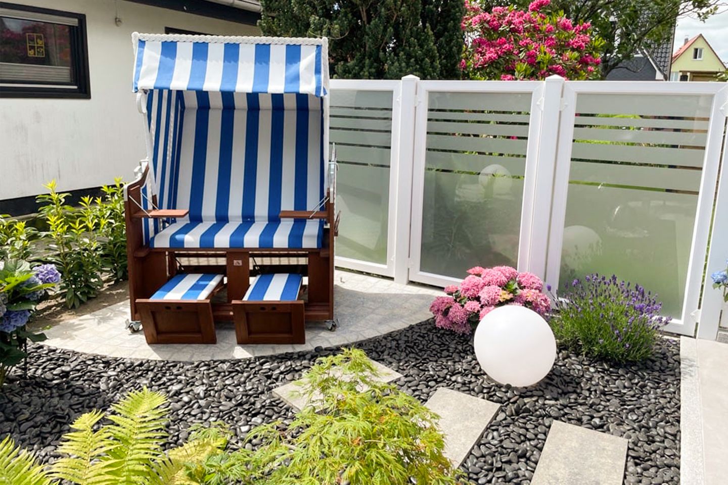 Das 268 qm große, komplett eingezäunte und sichtgeschützte Grundstück bietet Sicherheit für Kinder. Der liebevoll angelegte Garten mit Gartenmöbeln, Strandkorb sowie Sonnen- und Markisenschutz lädt dazu ein, den Tag entspannt im Freien ausklingen zu lassen.