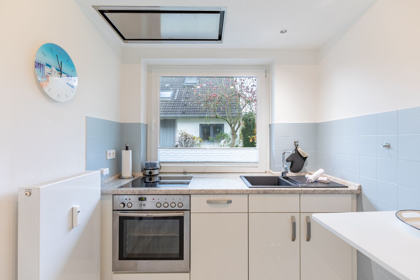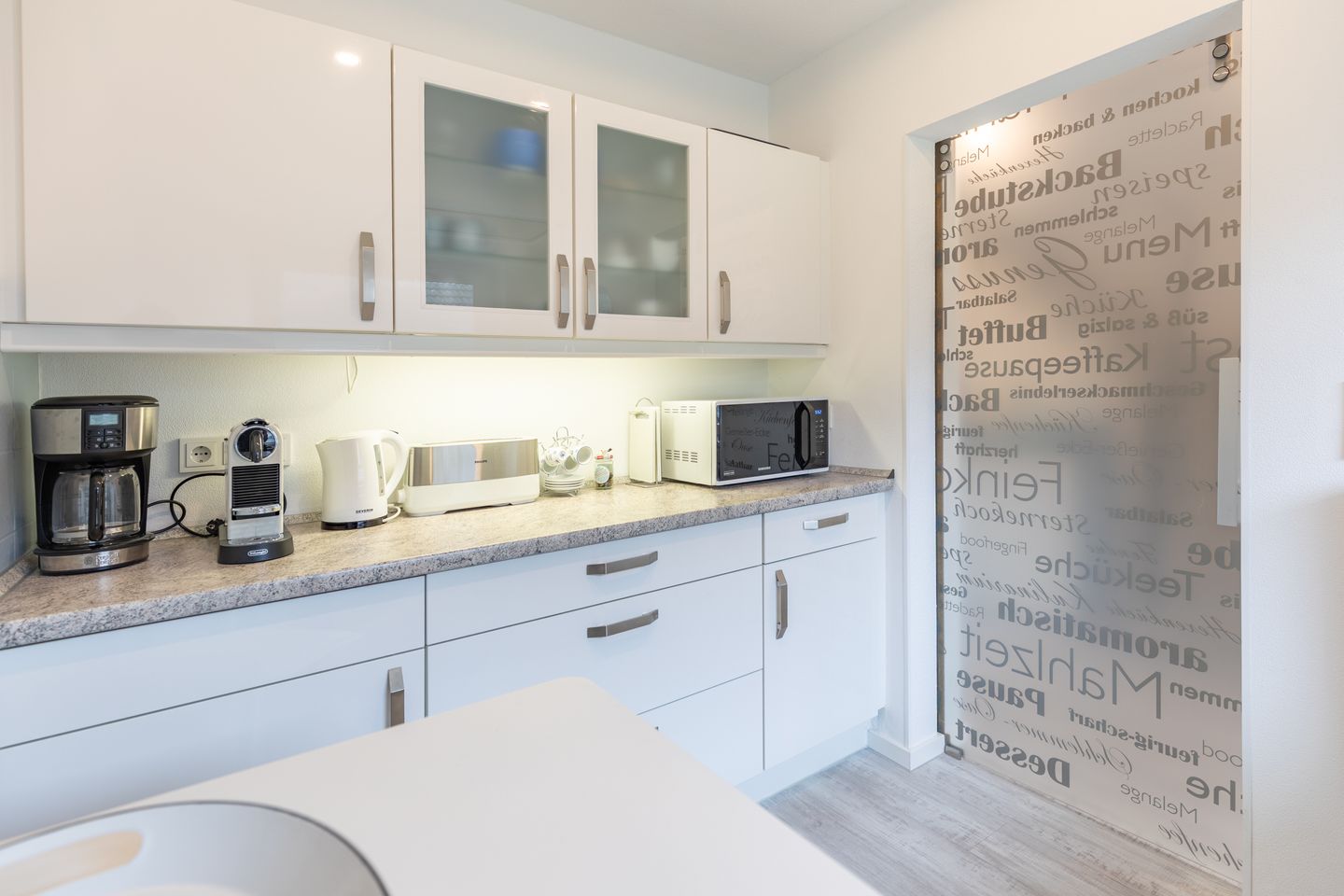 Die geschlossene Küche wurde umfassend modernisiert und ist vollständig ausgestattet, um sowohl einfache Mahlzeiten als auch aufwendige Gerichte problemlos zuzubereiten. Neben modernen Küchengeräten stehen zahlreiche praktische Helfer sowie eine Auswahl an Gewürzen zur Verfügung. Der angrenzende Essbereich bietet ausreichend Platz für gemeinsame Mahlzeiten in entspannter Atmosphäre und fördert das gesellige Zusammensein.