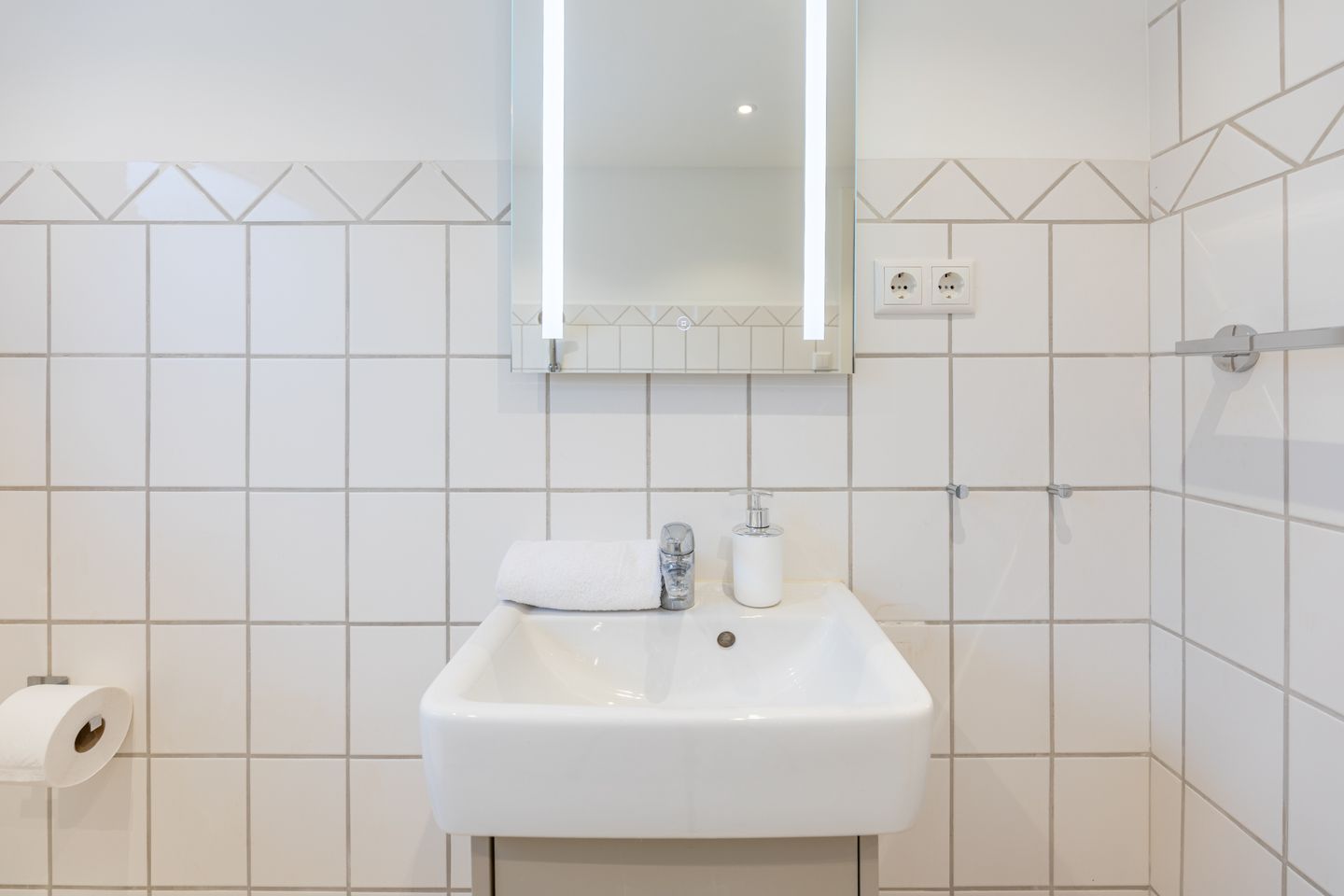Das obere Badezimmer ist mit einer Dusche ausgestattet (ohne Badewanne).
