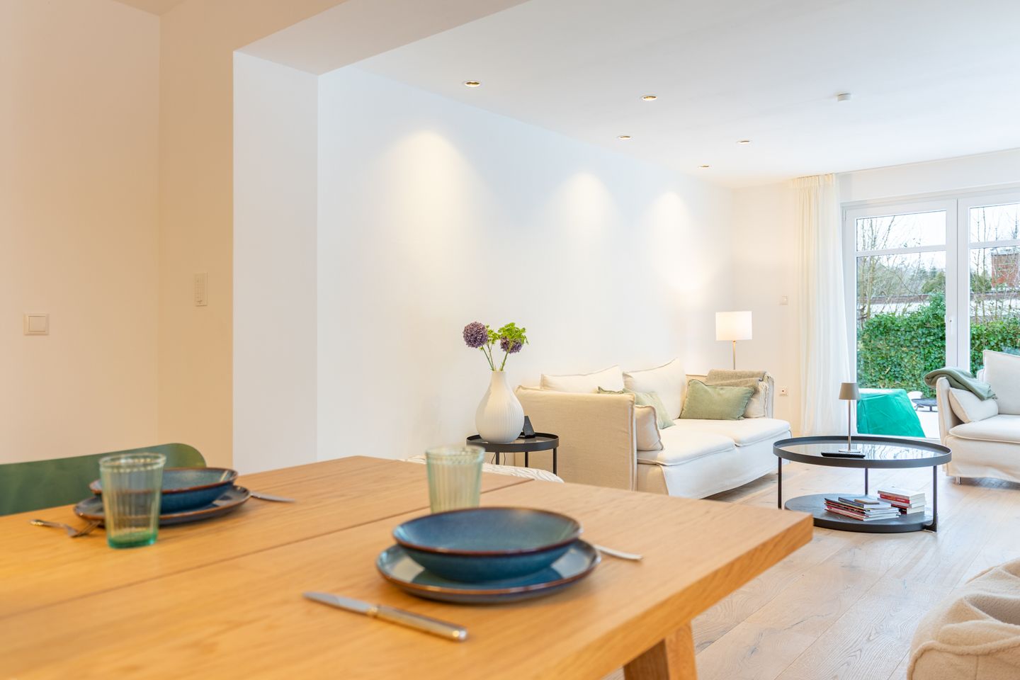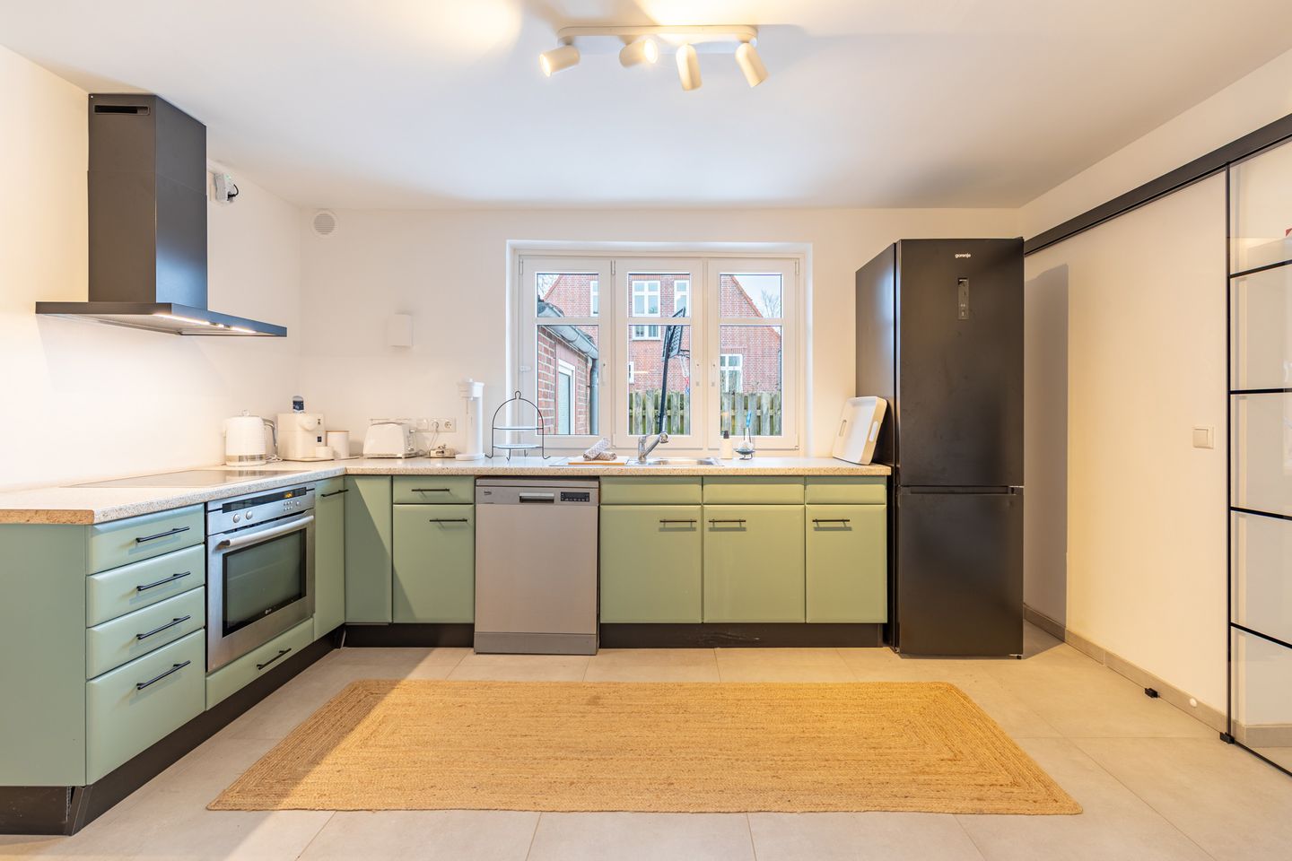 Die voll ausgestattete Küche eignet sich auch bestens für längere Aufenthalte: Ceran-Kochfeld, Backofen, Kühlschrank mit Gefrierfach, Spülmaschine sowie Espressomaschine, Wasserkocher, Toaster und Mixer sind vorhanden. Geschirr, Besteck, Küchenutensilien, Geschirrhandtücher, Gewürze und Abfalleimer stehen ebenfalls bereit.