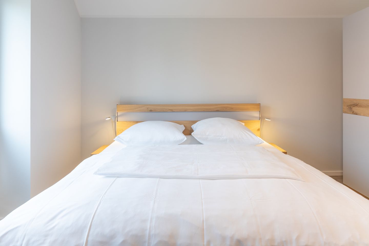 Über eine offene Holztreppe erreichen Sie das 1. Obergeschoss mit zwei großzügigen Schlafzimmern (Betten: 180 x 200, Kleiderschränke) Alle Fenster in den Schlafräumen lassen sich mit Plissees abdunkeln.