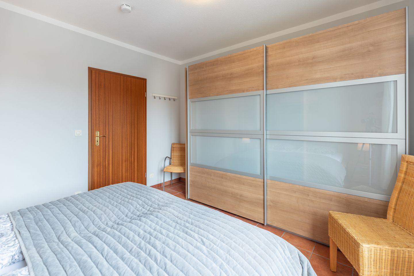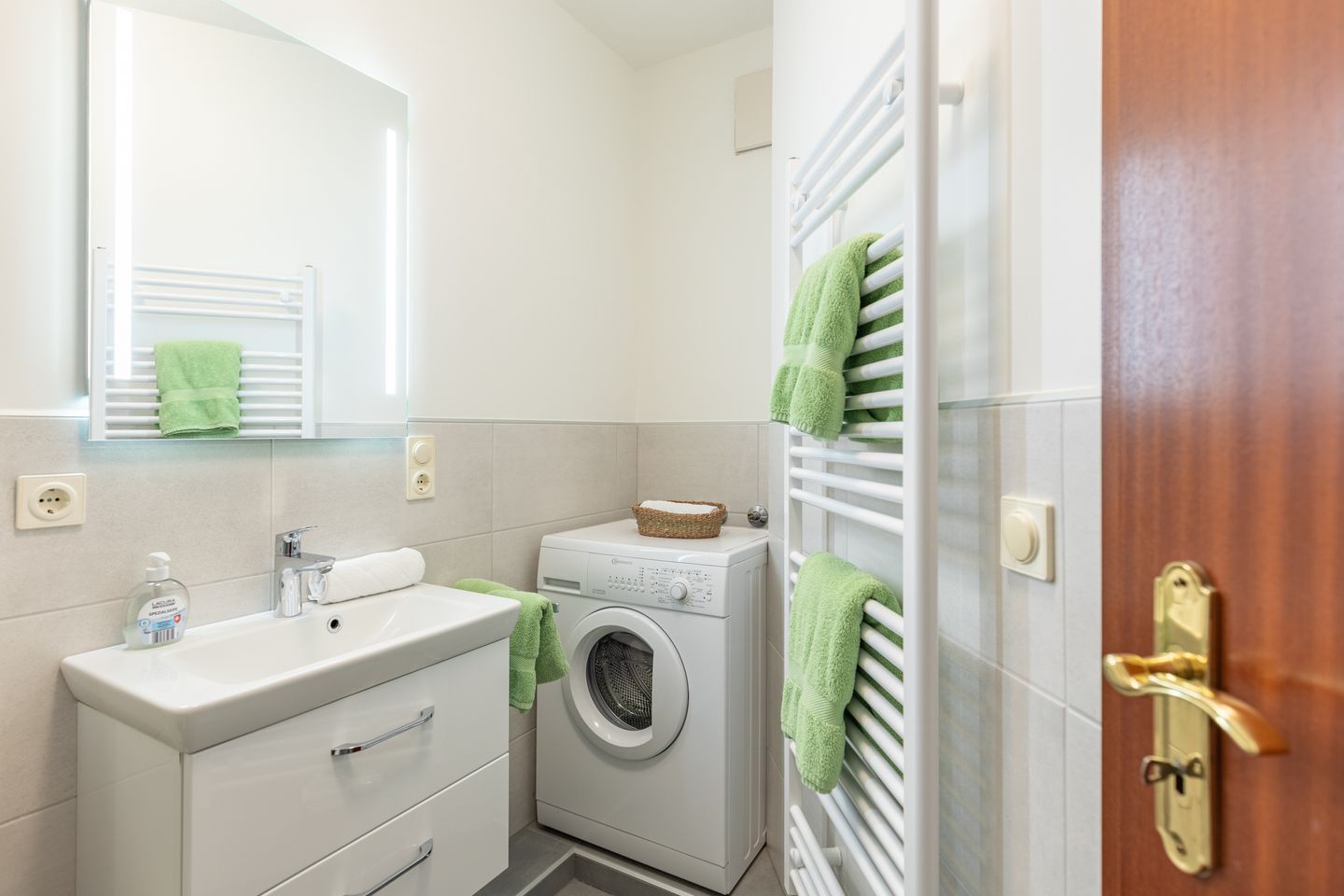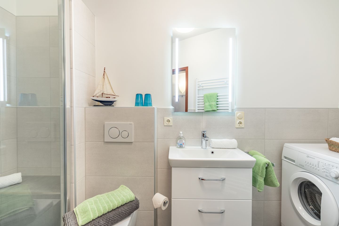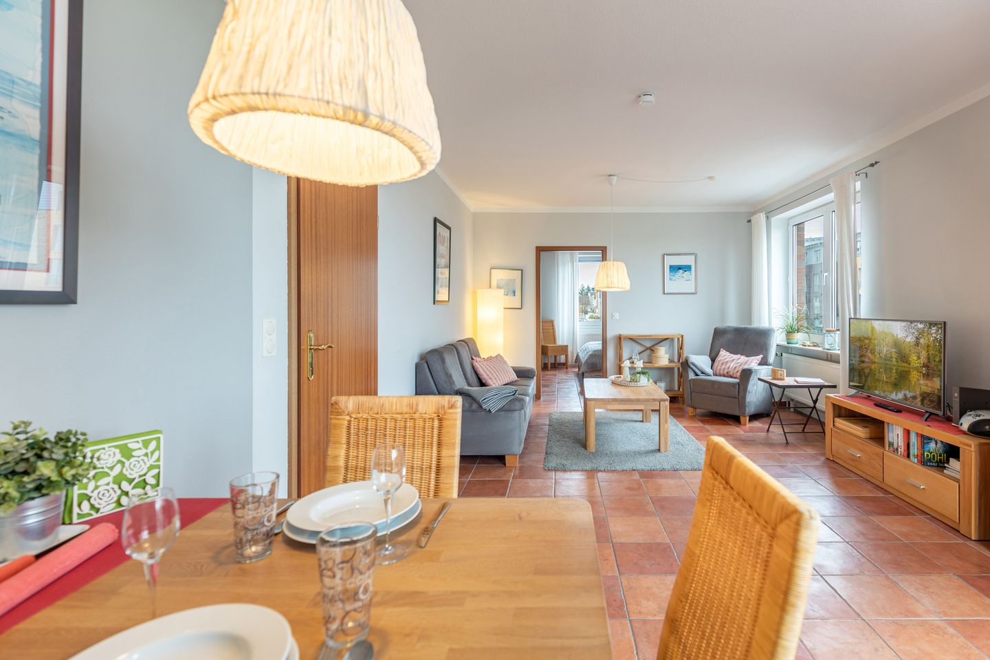 Die helle, lichtdurchflutete 56 qm² große Ferienwohnung liegt im 1. Stock und ist über das Treppenhaus erreichbar. Sie bietet Ihnen: ein Schlafzimmer mit einem großen Doppelbett (180 × 200), eine gut ausgestattete Küche mit einem 4-Platten-Herd, Backofen, Geschirrspüler, einer Filterkaffeemaschine (Filtergröße 4), Kühlschrank mit Gefrierfach, einem Wasserkocher, Mixer und einem Toaster. Der Wohnbereich verfügt über ein 3er-Sofa, einen Sessel, einen Flachbildfernseher und hat direkten Anschluss zum Essbereich, mit einem schönen Esstisch und einem Balkon mit Sitzgarnitur. Das Badezimmer verfügt über eine bodenebene Dusche mit WC, Waschbecken und einer Waschmaschine zur alleinigen Nutzung.
